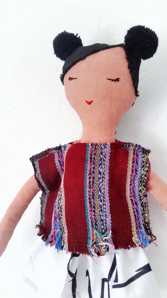 Organic cotton body, hand embroidered face, hair is cotton rayon blend with knit pom pom pigtails. Skin tone is sienna (hand dyed), hair color is black.