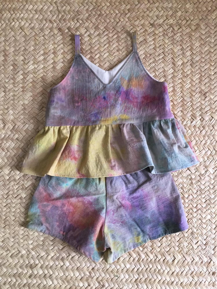 Ice-dyed organic cotton, ruffled top with matching shorts, super comfortable design. Mix and match with your other favorite summer skirts, shorts and tops!