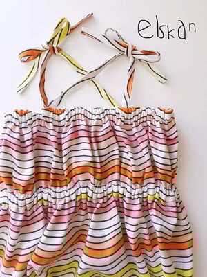 This one of a kind bubble romper is made from soft designer cotton in a sunset wave print. Easy pull on style with elasticized waist and chest, adjustable tie straps for a perfect fit.
